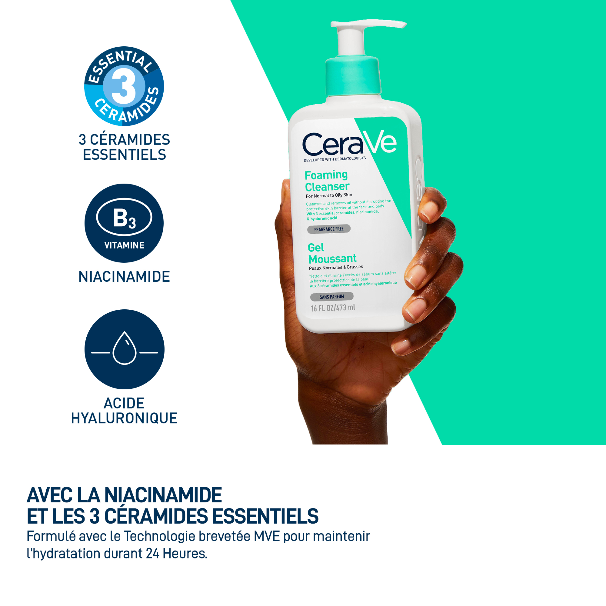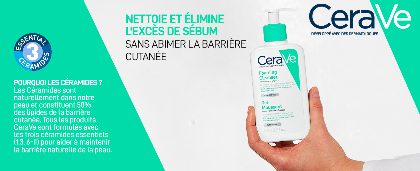 - 3 Céramides Essentiels : tous les produits CeraVe contiennent les 3 céramides essentiels (1, 3 et 6-II) dont une peau saine a besoin pour restaurer et maintenir sa barrière protectrice naturelle.